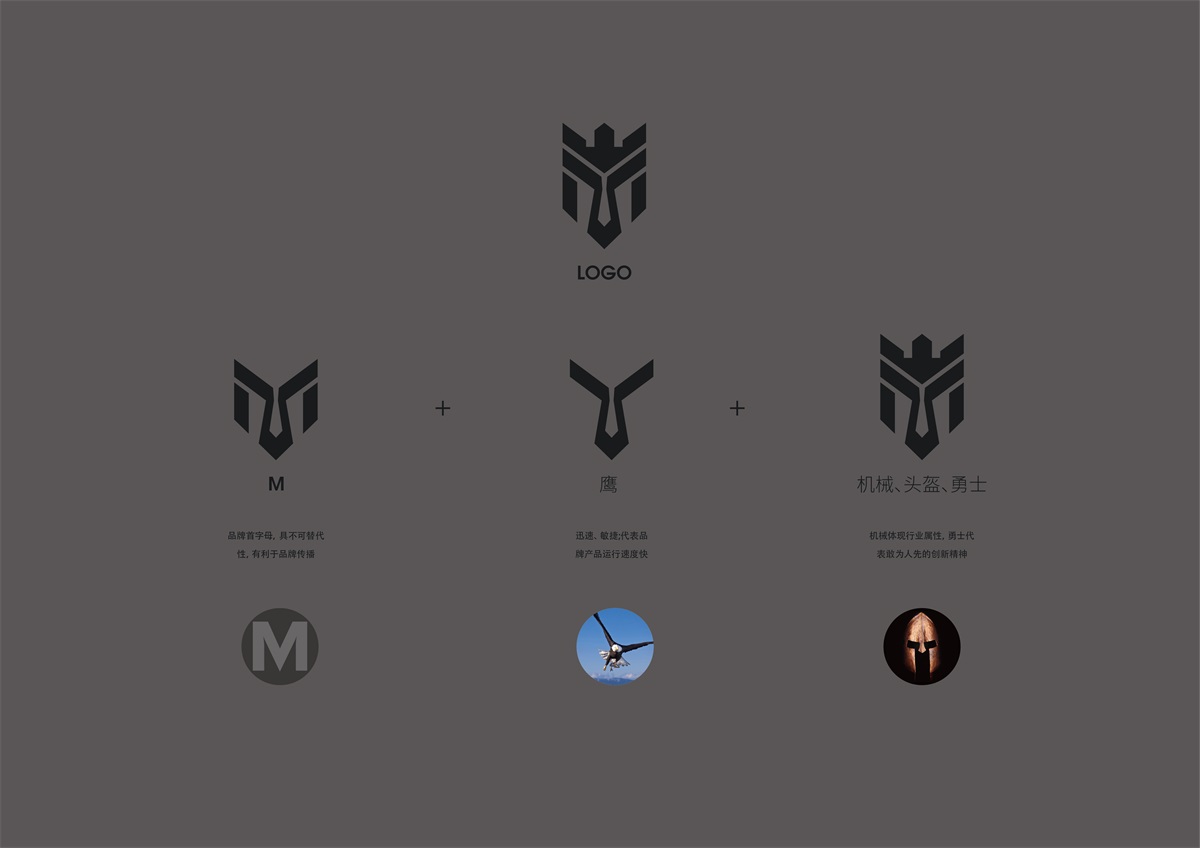 品牌LOGO以字母M、鷹、頭盔、勇士、機械巧形象妙結合成而成,字母M是品牌首字母,具有不可替代性,有利品牌傳播;鷹代表迅速、敏捷,寓意品牌產品運行速度快;盔甲、勇士、機械體現行業屬性,勇士代表敢為人先的創新精神;搭配無襯線字體,使整體視覺感強,簡約、時尚、科技。