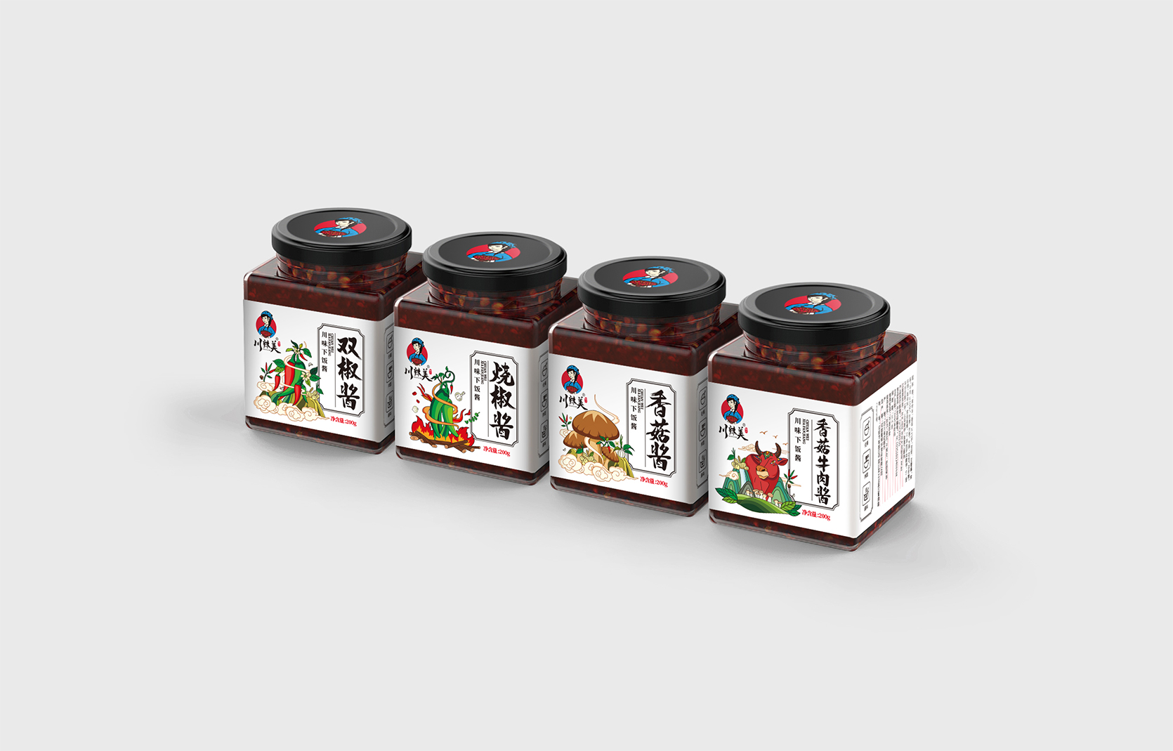 來自四川的美味辣椒醬品牌,古風、韻味、親和,從品牌logo設計,包裝瓶的選擇,到系列包裝形象設計,方案將雙椒醬、燒椒醬、香菇醬、香菇牛肉醬四個品類以插畫風格進行創作,以系列感來呈現,品牌感強,接地氣